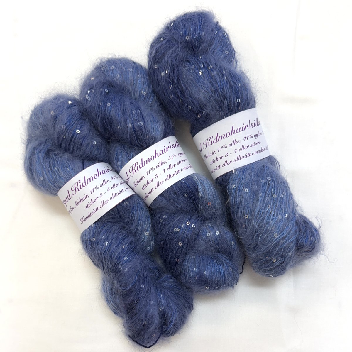 Kidmohair/silke med paljetter, denimblå, härvor á 100g = 380m.
