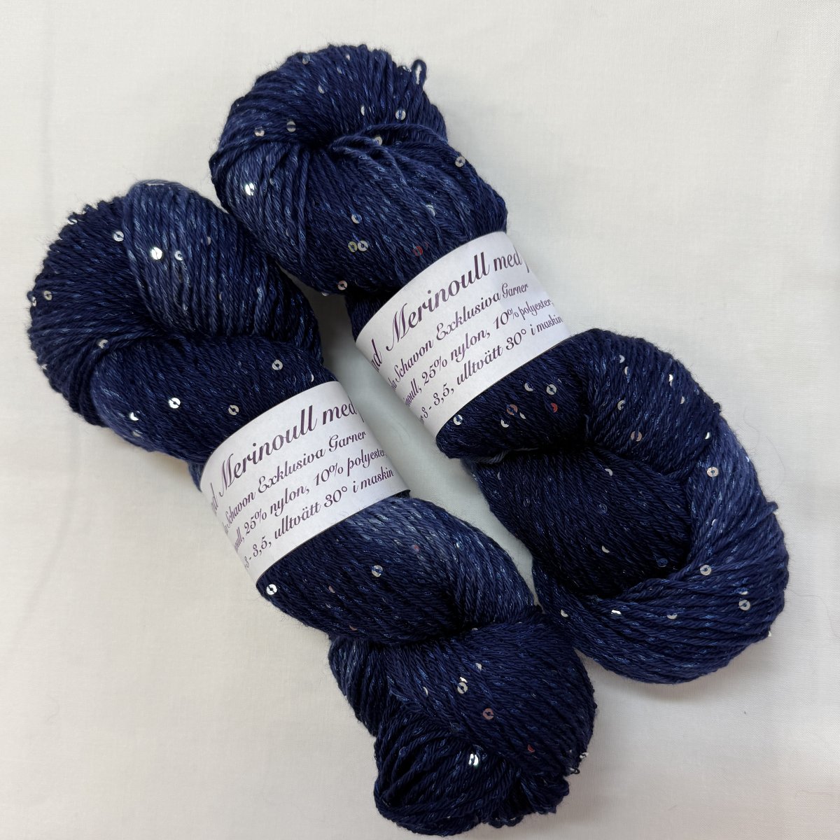 Handfärgad Merino med paljetter, marinblå, härvor á 100g