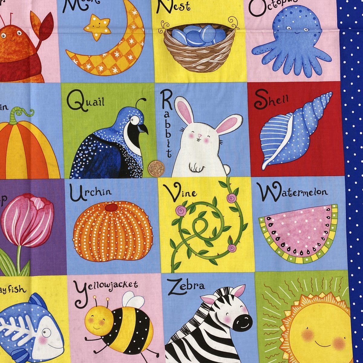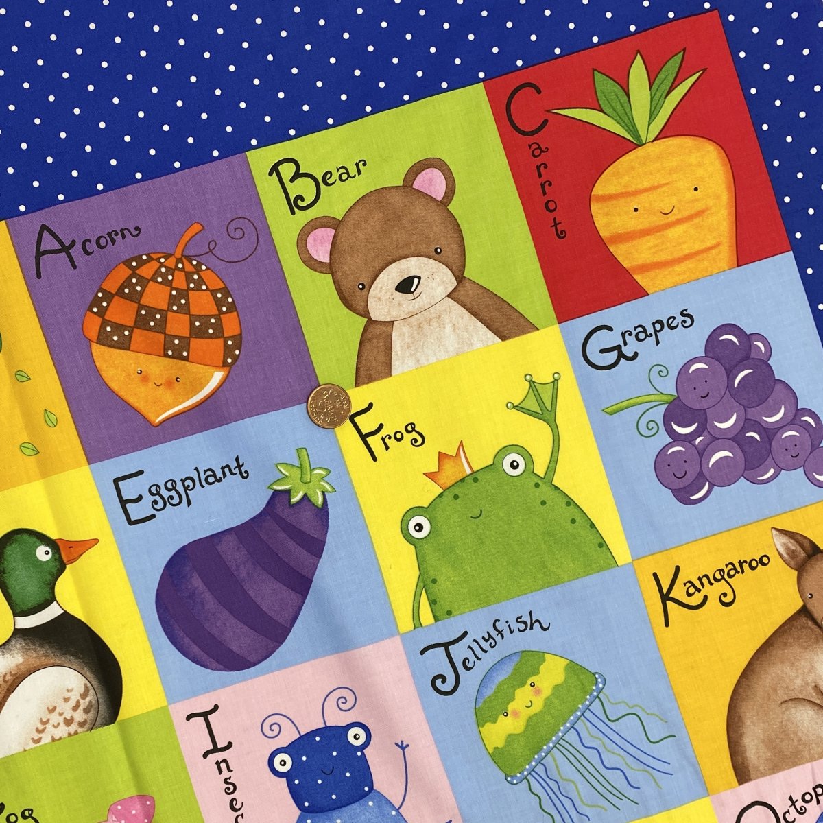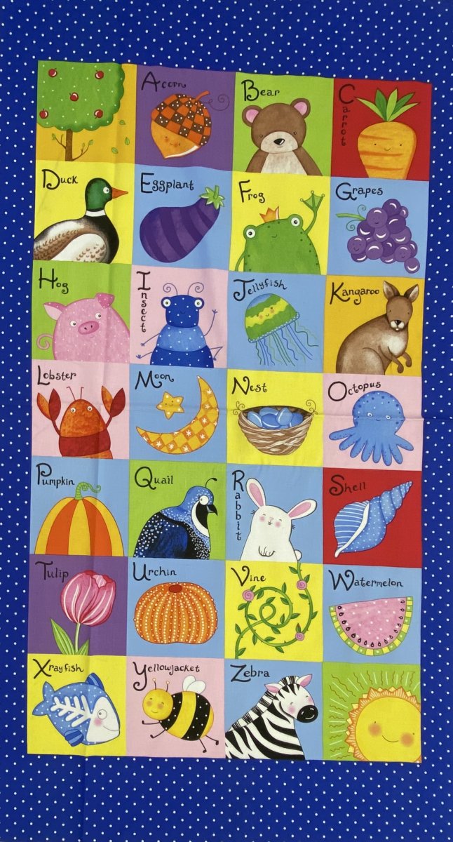 Ett tyg där man kan lära sig det engelska alfabetet med olika motiv från A-Z.