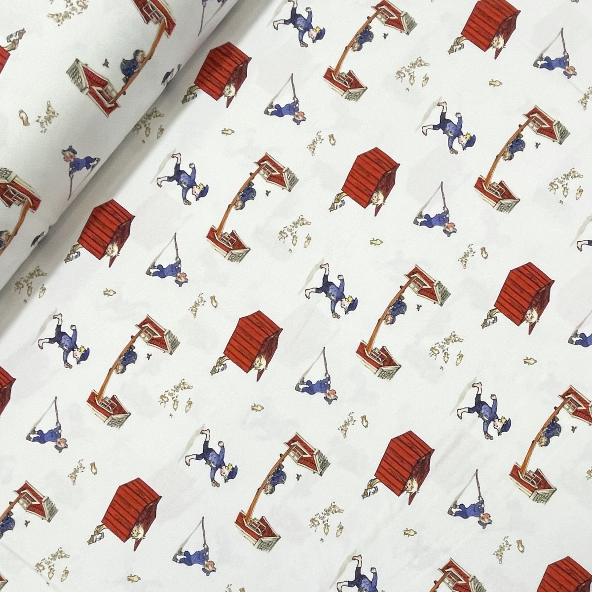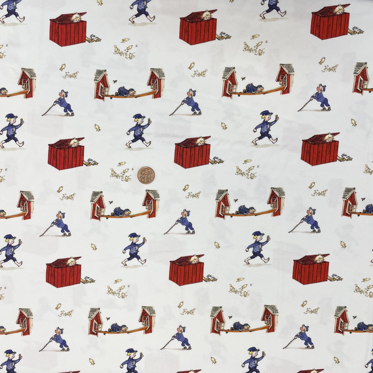 Ett jersey tyg med olika motiv av Emil i Lönneberga ute på sina upptåg som är tryckt på en vit botten, passar bra till både de stora som de små.
