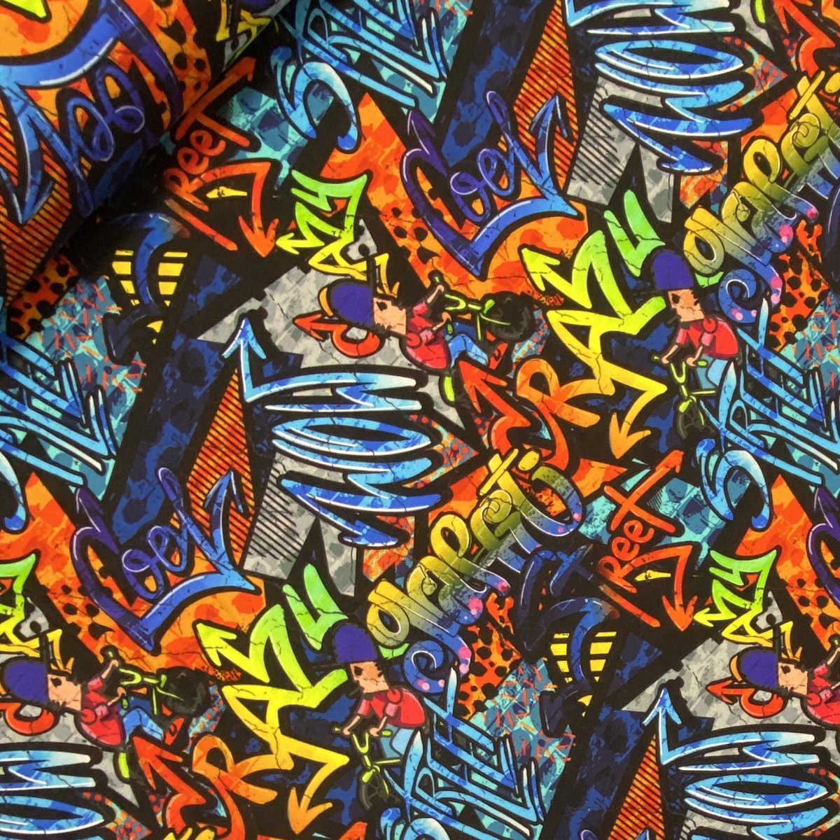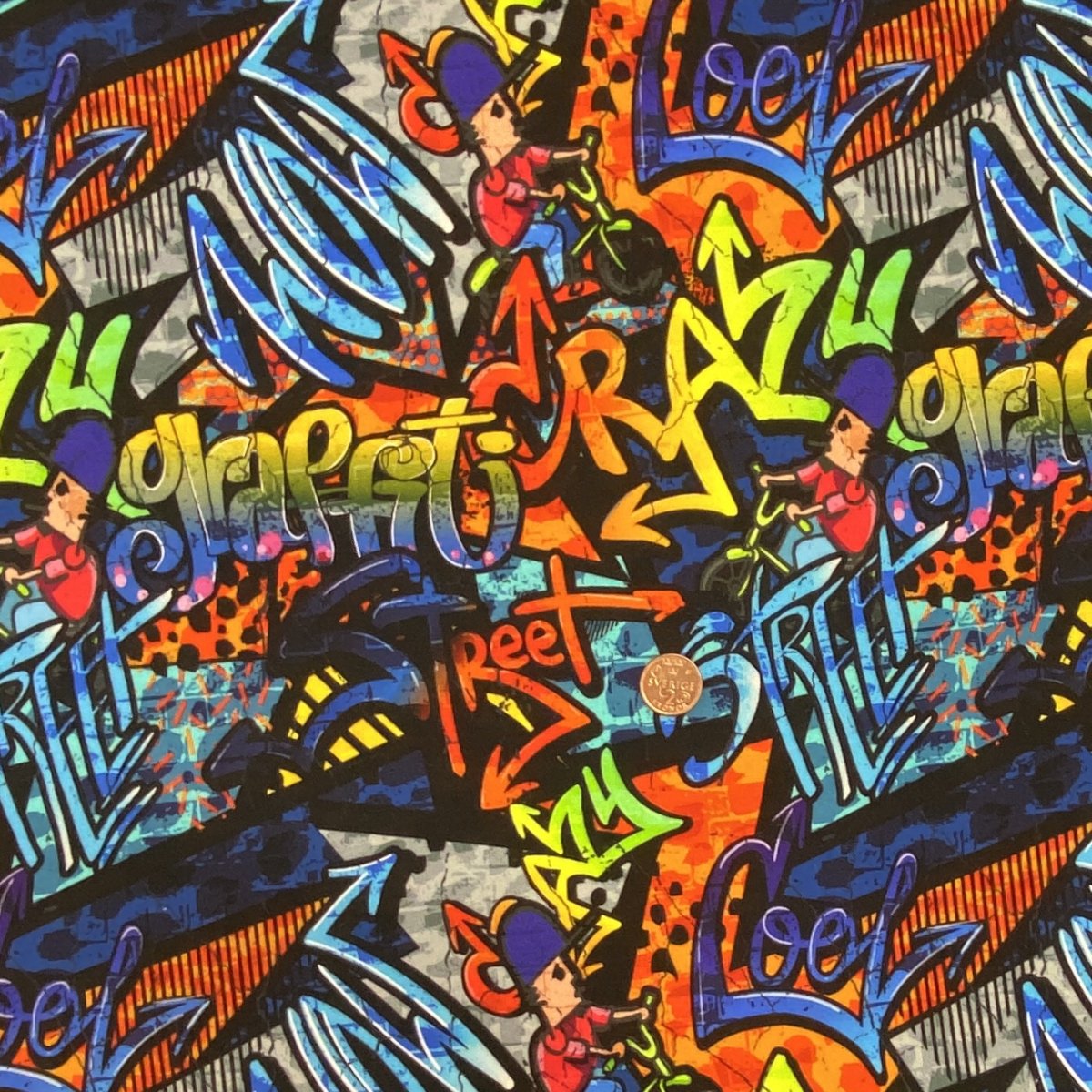 En french terry jersey med olika grafitti motiv i många starka färger och nyanser.