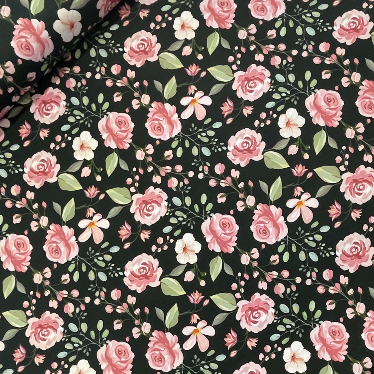 Ett jersey tyg med rosa blommor på svart botten, passar bra till både de stora och små, du kan göra klänningar, t-shirt, kjolar, mössor pannband, filtar mm.