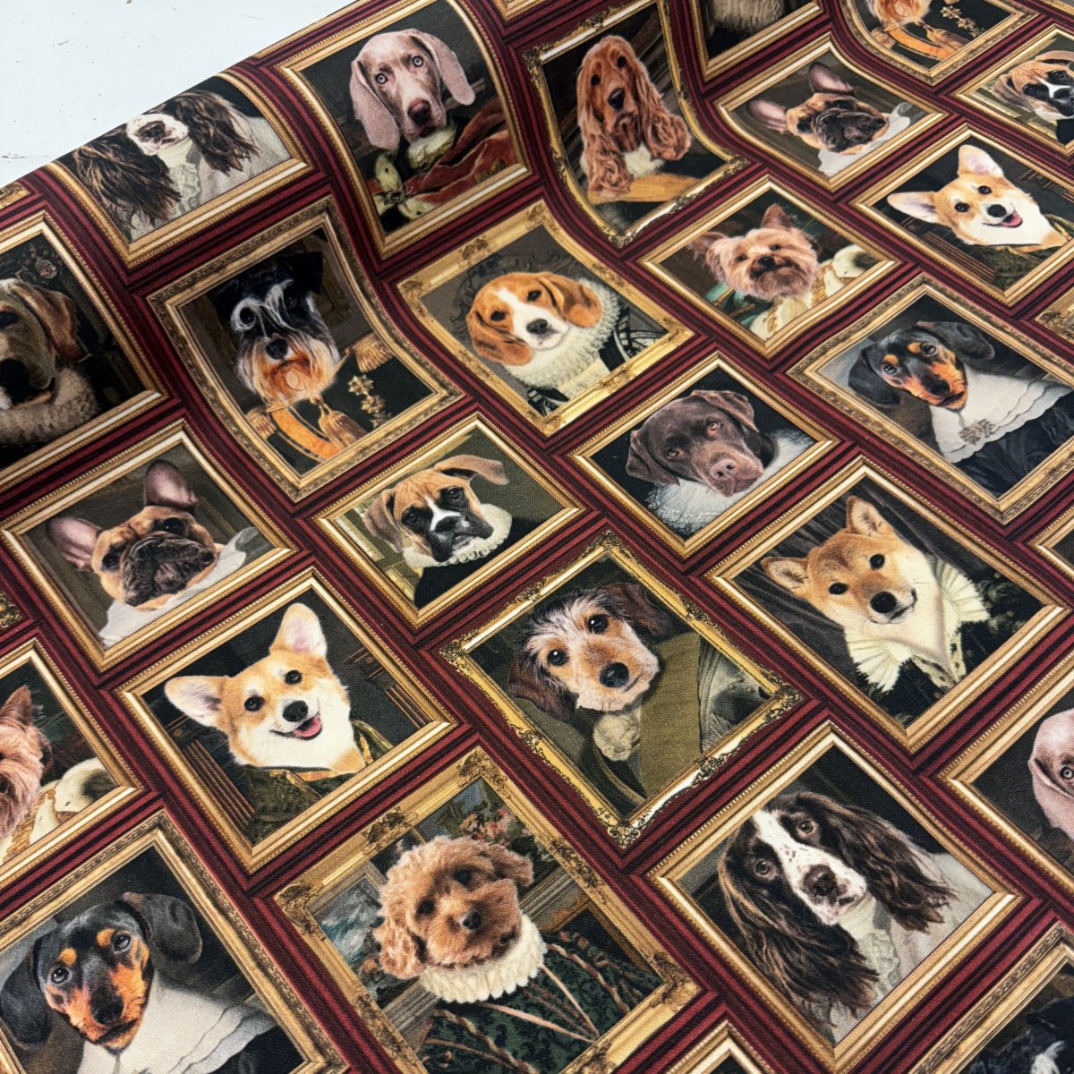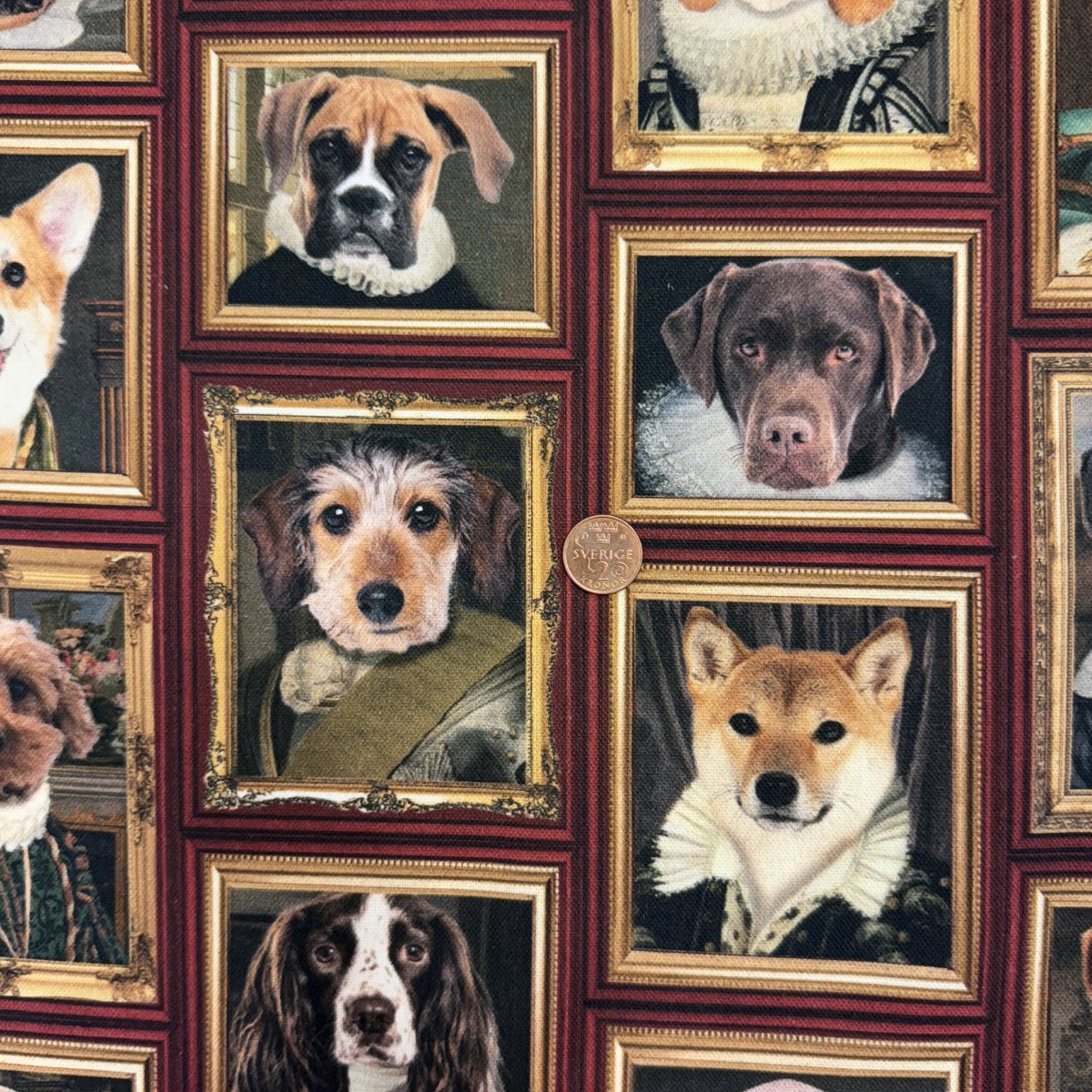 Tygbredd 140cm, 100% bomull, med motiv av tavlor med olika hundraser.
