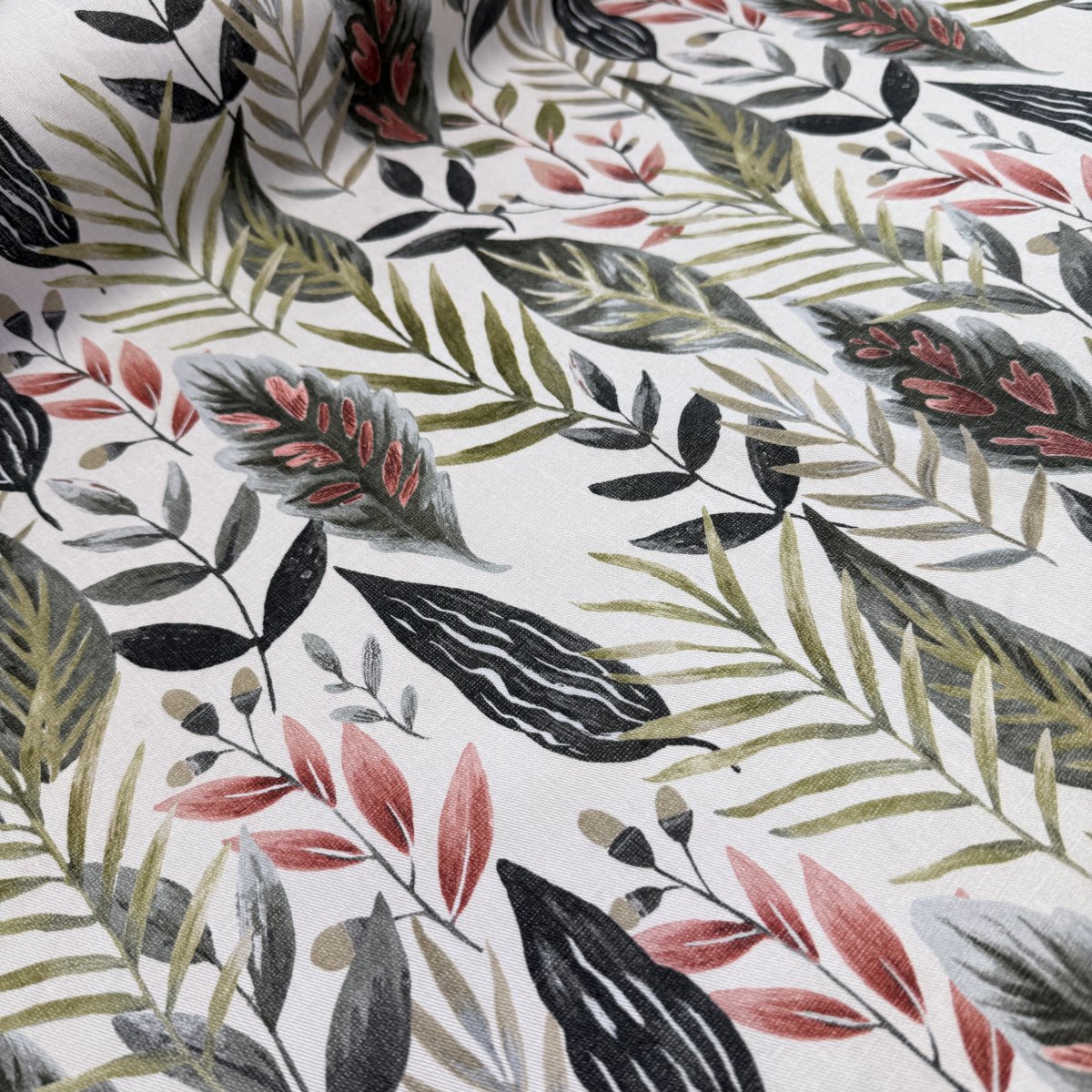 Gardintyg med blad i olika nyanser och former på vit bakgrund,