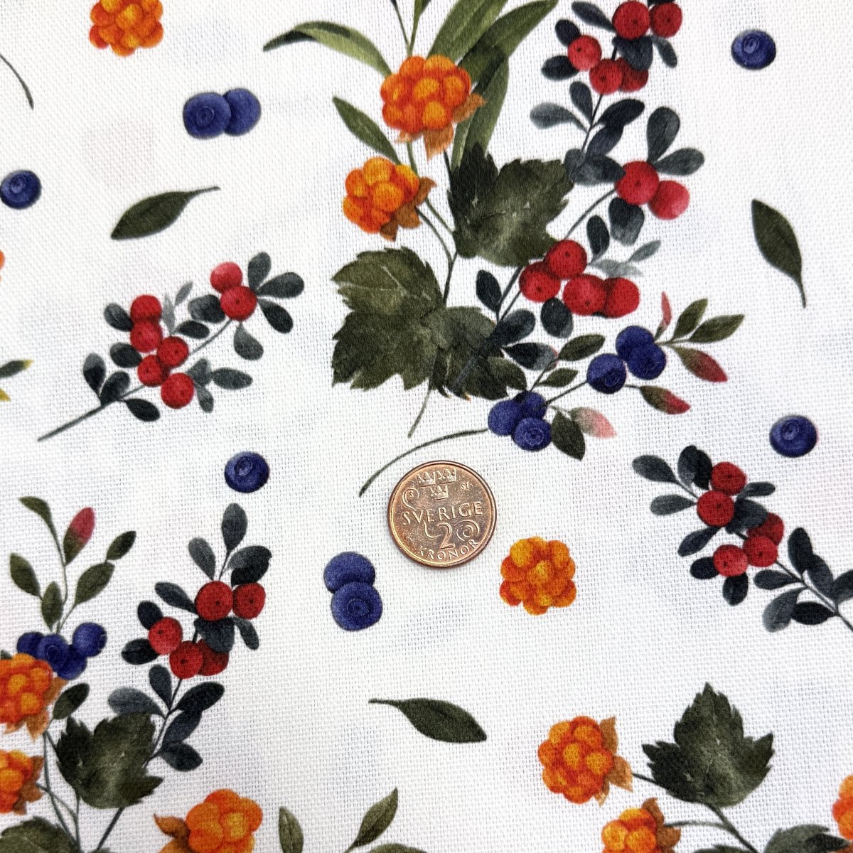 Gardintyg i 100% bomull med sommarens olika bär på vit bakgrund.