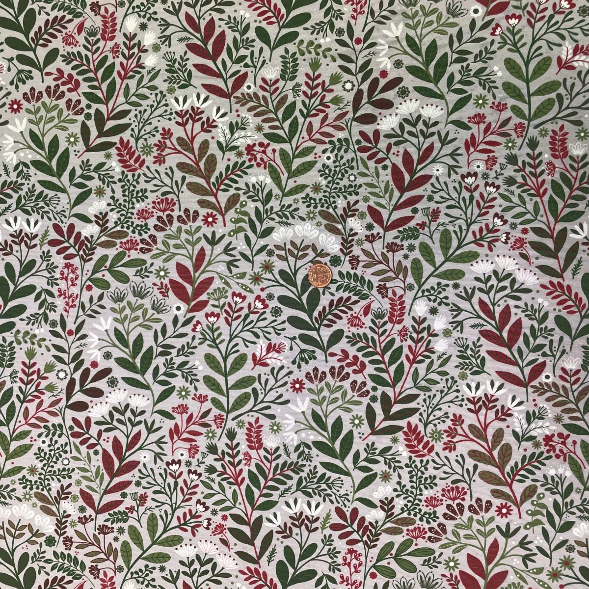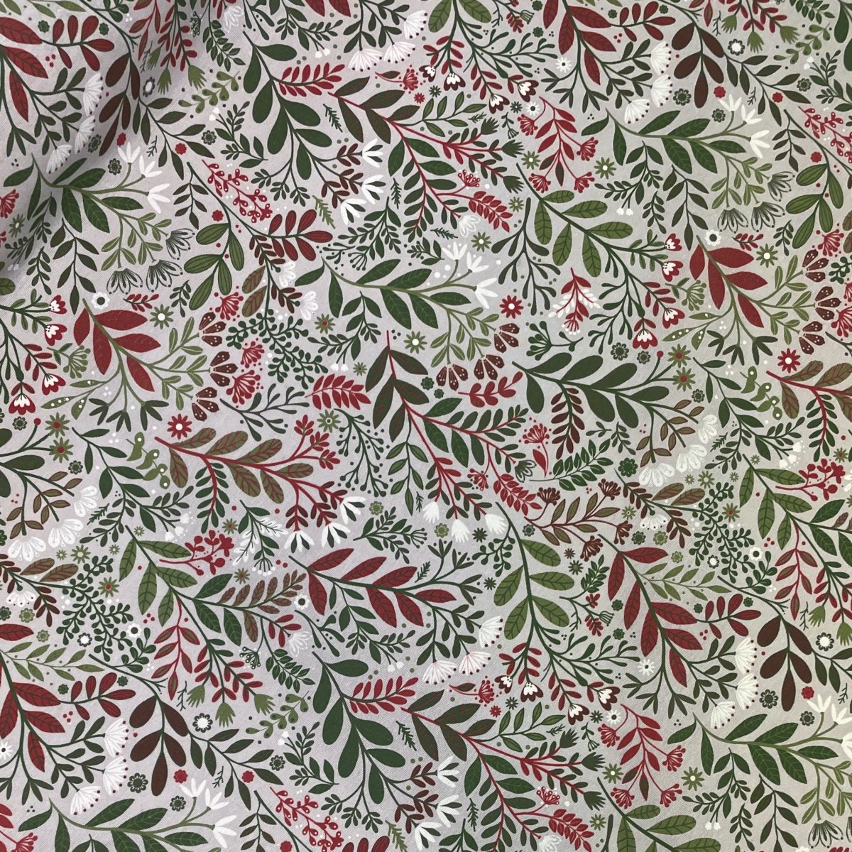 Blad mönster i rött och grönt på en linnefärgad botten som passar bra till både långa gardiner längder som till gardinkappor, kuddar och dukar.