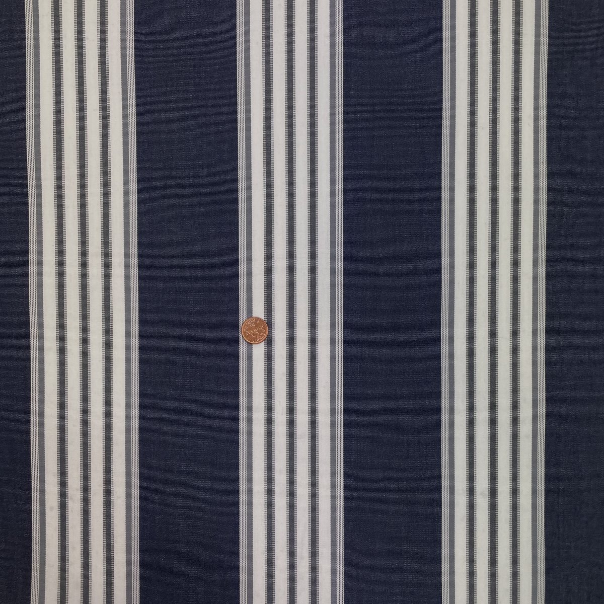 Markisväv i marinblå/grå/vit/randig, den marinblå randen är ca. 8cm och den vita mäter 8,5 cm med olika grå och vita ränder.